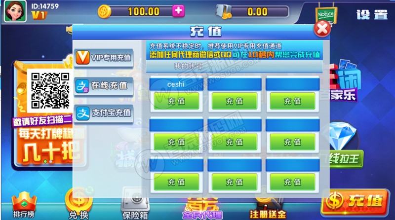 | 威漫棋牌游戏仿蓝月完整运营版本 前端管理控制+后台点控 这款威漫棋牌包括有多个游戏,分别有捕鱼、水浒传、红黑大战、龙虎大战、抢庄牛牛、炸金花、百j乐、九线拉王,服务端为nodejs+mysql 前端cocos2d-lua,前端配有管理控制以及后台点控。附带有更新资源以及全民代理系统,这是完整运营版本。 |