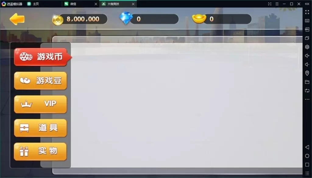 大咖竞技支持商城系统,玩家可以进行充值、以及兑换商品功能。游戏大厅其余菜单:支持玩家分享游戏、查看游戏币排行榜、以及游戏玩法获取帮助等选项。